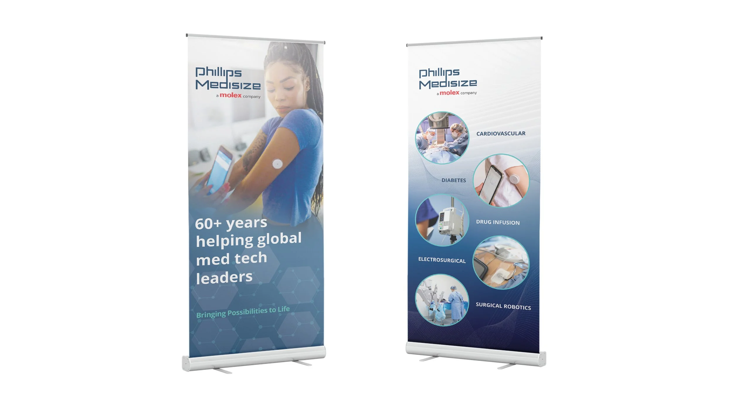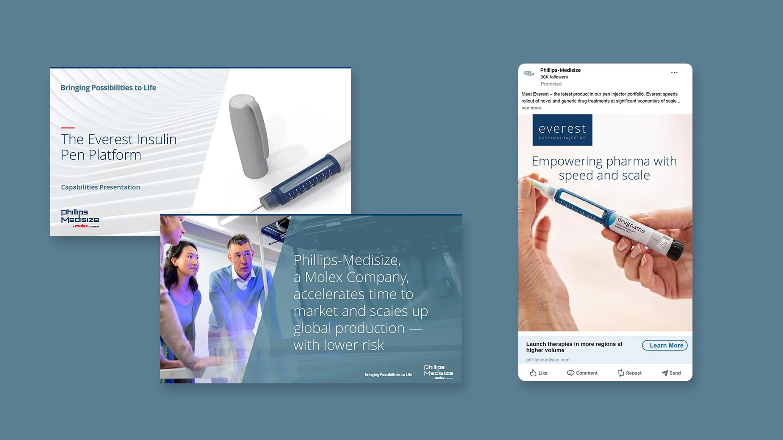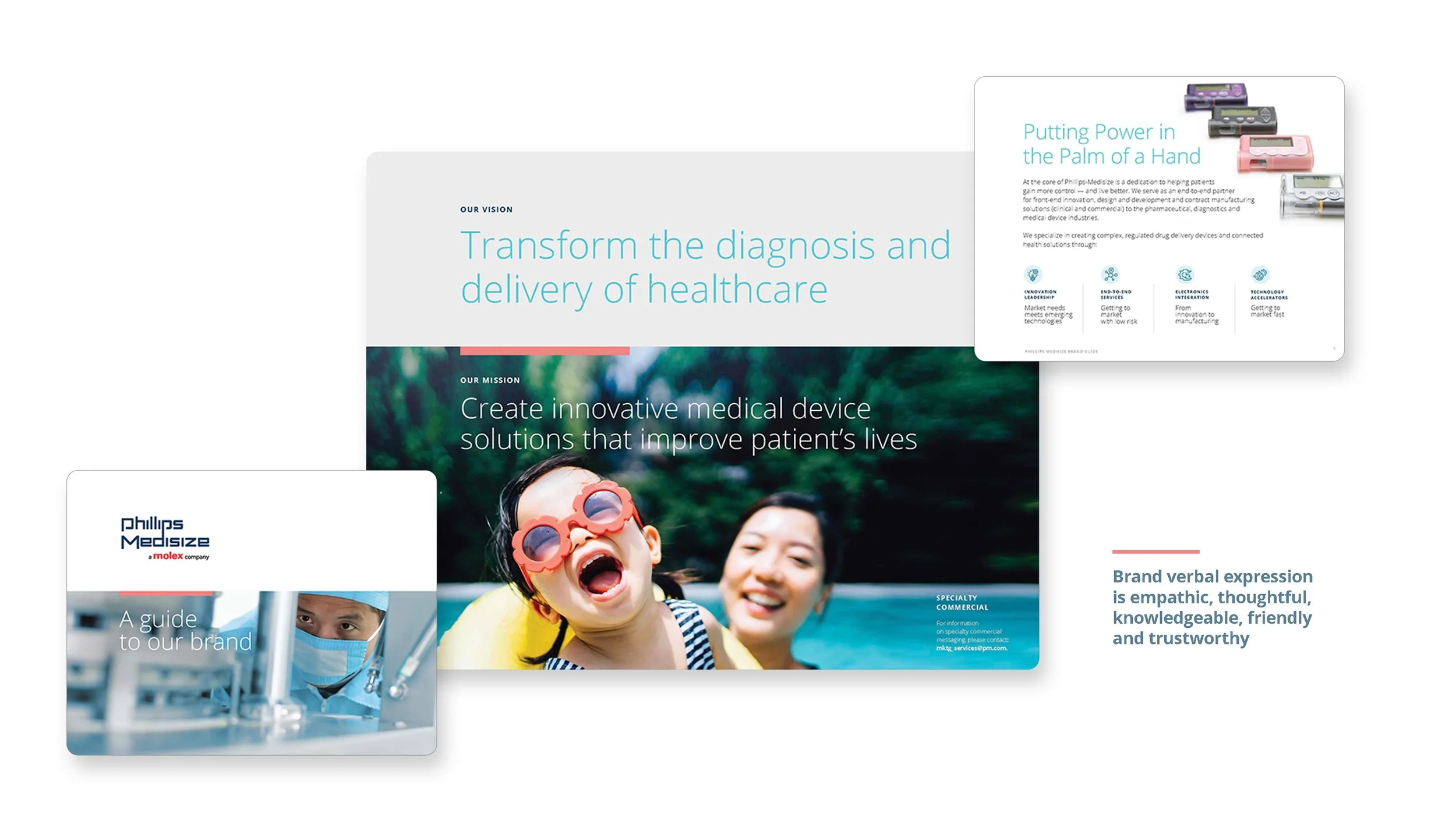 Drug delivery pens, glucose monitors, ECGs … Phillips Medsize is a global contract manufacturer that helps other manufacturers make lifesaving products. My team developed a softer, more human (and more hopeful) brand tagline brand look/feel and voice. Advertising and collateral built trust and more effectively moved leads through the sales funnel.